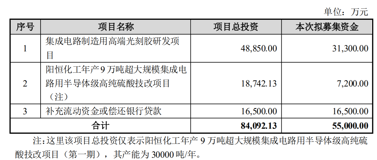 阳恒化工年产9万吨超大规模集成电路用半导体级高纯硫酸技改项目为江苏阳恒化工有限公司在原厂址区域内,在不增加硫酸总产能和排污总量及污染因子的前提下,通过引进技术装备对原基础化工产品工业用硫酸生产装置进行改造提升,生产部分半导体级高纯硫酸,实现技术改造标准达到国际先进水平,安全、环保、投入产出水平高于原项目水平。本次可转债发行用于本项目第一期投资,第一期产能为30000吨/年。