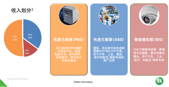安森美共有三大产品部门——电源方案部(PSG)、先进方案部(ASG)、智能感知部(ISG),其中ISG部门成长速度最快,虽然在安森美只有六年的历史,通过并购,安森美ISG部门的技术更迭速度非常快。