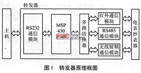 通常电表采用的有红外通信、RS485通信或无线射频通信三种通信方式,而普通的电表抄表器一般只带有上述三种通信接口的其中一种通信接口。为了能适用于常见的这三种电表抄表器,方便有效地把抄表器的数据传输到主机,数据转发器集成了这三种通信接口,完全收系统通过该数据转发器可以实现主机与电表抄表器的数据交换,是一个多通道计算机数据传输系统,结构原理如图 1所示。后三个通道模块通过一个多路转换器与单片机MSP430串行通信,而MSP430F149通过RS232通信模块与主机进行数据通信。