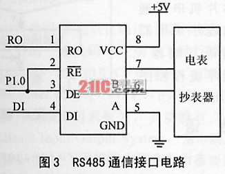MAX485是一种差分平衡型低功率收发器芯片。芯片中包含有1个驱动器和1个接收器,采用单+5V电源供电,专用于TTL协议(即通用于各种CPU的通信协议)与485协议间的转换,其RS485通信接口电路如图3所示。