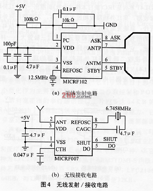 无线发射电路以MICRF102为核心,如图4(a)所示。MICRF102是Micrel公司推出的单片UHF ASK发射器,采用SOP(M)-8封装,芯片内包含:由基准振荡器、相位检波器、分频器、带通滤波器、压控振荡器构成的合成器,发射偏置控制,RF功率放大器,天线调谐控制和变容二极管等电路,是一个真正的“数据输入-无线输出”的单片无线发射器件。