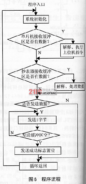 数据传输在PC主机与电表抄表器之间进行,PC机通信程序通过VB(VisualBasic,可视化Basic编程语言)的MSComm控件实现的。MSP430F149单片机选用32768Hz振荡频率,波特率为4800b/s,采用串行通信的半双工方式。单片机串行通信程序要用汇编语言编程,程序流程如图6所示。