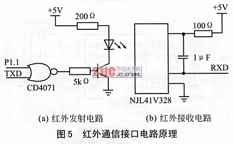 主要由NJL41V328组成。NJL41系列是JRC(新日本株式会社)新推出一体化红外线接收器,集红外线接收和放大于一体,不需要任何外接元件,就能完成从红外线接收到输出与TTL电平信号兼容的所有工作,而何种和普通的塑封三极管大小一样。因此,它适合于各种红外线遥控和红外线数据传输,是代替接收二极管等红外接收放大器的理想元件。将NJL41V328用于转发器与电表抄表器之间的数据交换,实现了转发器与电平抄表器之间的无线数据通信,图5是红外通信接口电路原理图。