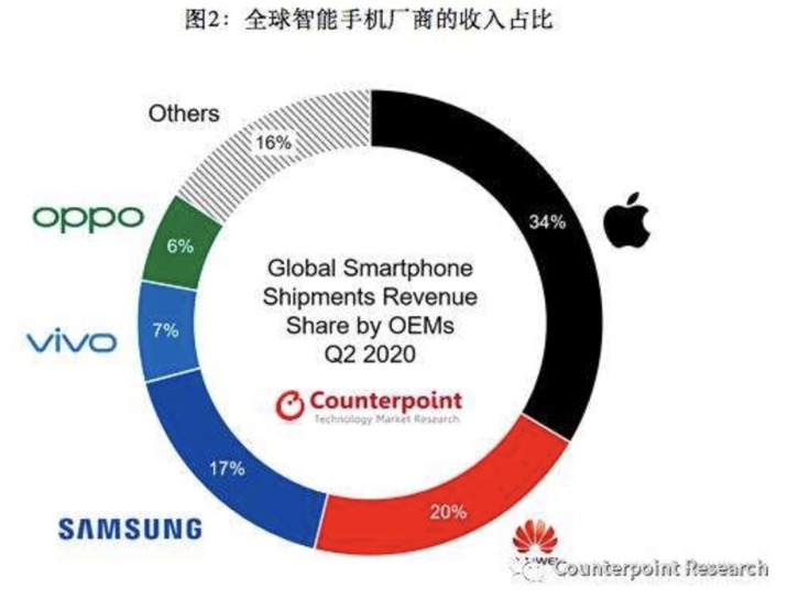 市场研究公司Counterpoint Research的报告显示,2020年第二季度,苹果的智能手机收入排名第一,其抢占了约59%的全球智能手机行业利润。