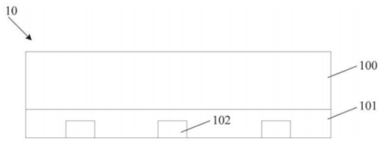 如上图,为待键合的上晶圆示意图,其中上晶圆10可以为单个晶圆,也可以由多个晶圆堆叠而成,各晶圆包括衬底100,其材料例如为Si衬底、Ge衬底、SiGe衬底等,在衬底上有覆盖层101,覆盖层为单层结构或叠层结构,包括层间介质层、金属间介质层,其材料例如为氮化硅、氧化硅等。