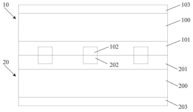 如上图,为待键合的下晶圆示意图,下晶圆20上有覆盖层201,覆盖层同样为单层结构或叠层结构,其中包括层间的介质层以及金属介质层,其材料由氮化硅、氧化硅等构成,在覆盖层中形成有待对准的图形202,在上晶圆10和下晶圆20进行键合时,上晶圆中的待对准图形102与下晶圆中的待对准图形202键合对准。