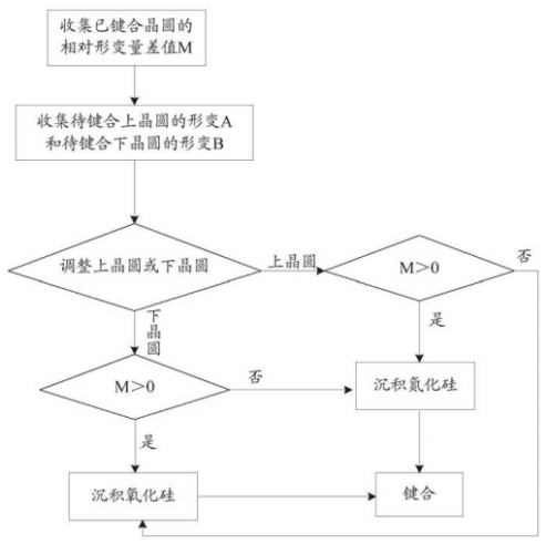 如上图,为该专利中发明的键合方法形成键合结构过程中的流程示意图,可以看到,收集键合之后的上晶圆和下晶圆的相对形变量,将晶圆和上晶圆的形变的差值作为相对形变量差值,记为M。