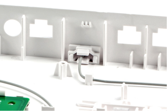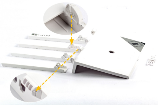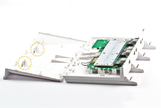 华为路由器AX3 Pro的4根平板天线根部使用内扣式卡扣固定在相应的组装位上。由于卡扣固定较紧,不能轻易取下。