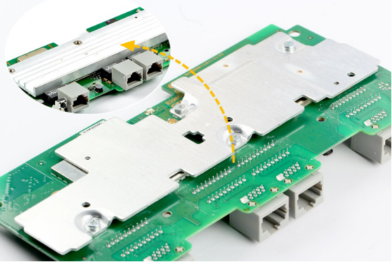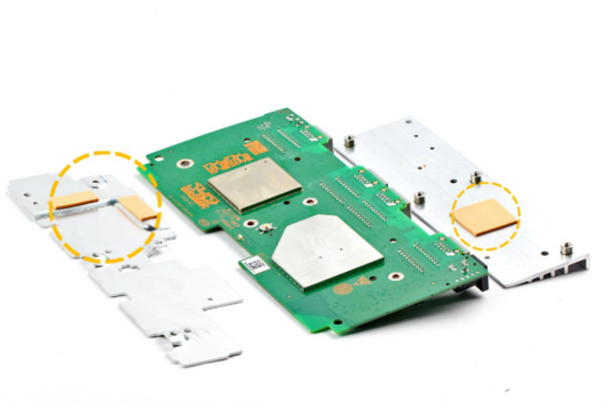 拧下华为路由器AX3 Pro的铝制散热块的4颗十字螺丝,卸下两块散热块,我们能看见两块散热块与主板之间都有导热硅脂胶垫作为辅助导热材料。