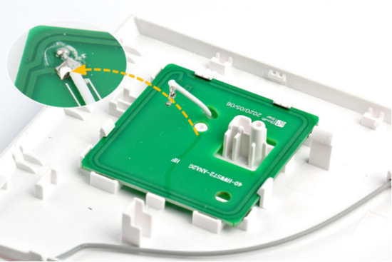 华为路由器AX3 Pro支持手机NFC一碰连接Wi-Fi功能。支持这一功能的NFC使用一块正方形PCB天线板,天线板与主板之间采用通过焊锡固定的同轴线连接,天线板使用卡扣方式固定在顶盖右下侧,拆解时需要破坏卡扣才能取下。