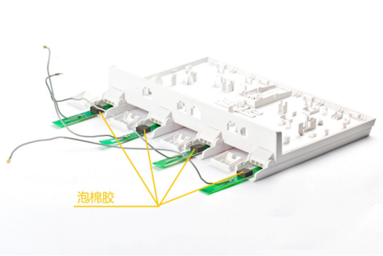 撬开华为路由器AX3 Pro的4根天线底部的塑料盖,可以看见AX3 Pro使用4根PCB Wi-Fi天线,2.4G /5.8G间隔排列组装,每一根天线板中部和顶部各有两块泡棉胶用来增强固定和支撑PCB板。
