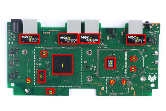 华为路由器AX3 Pro的主板上使用4个灰色千兆以太网口,支持WAN/LAN盲插技术,网口都使用了东莞铭普光磁的H2038DG以太网网络隔离变压器。