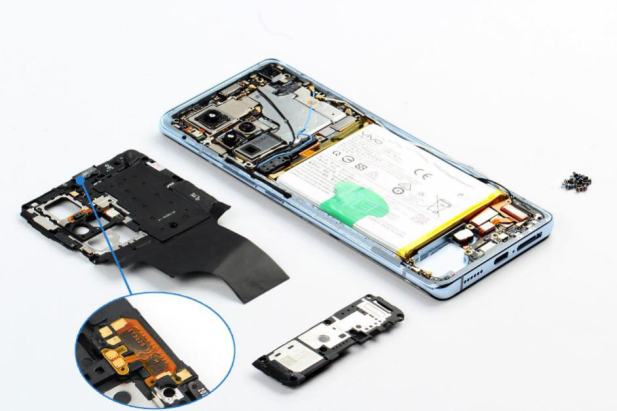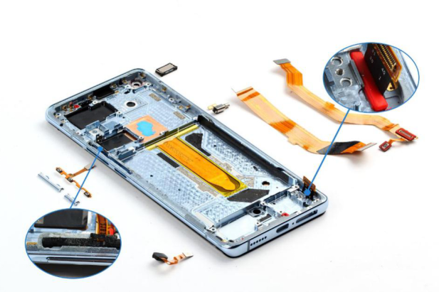 依次取下vivo X50 Pro的按键软板,听筒,指纹识别传感器软板,振动器,主副板连接软板等器件。在内支撑上屏幕软板穿过的缝隙处,按键软板槽口处都塞有橡胶塞保护作用。