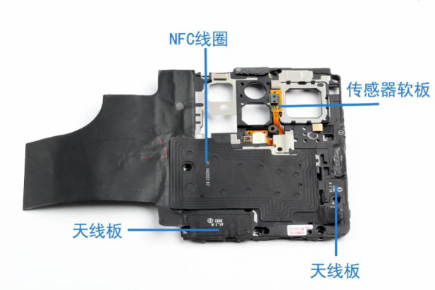 在vivo X50 Pro的主板盖上除了有大面积石墨片外,还有NFC线圈,传感器软板和天线板。