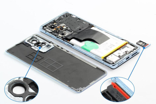 取出vivo X50 Pro的卡托,用热风枪加热后盖后,结合撬片慢慢撬开。X50 Pro卡托上设有防水胶圈,分离后盖后可以看到后盖上泡棉,在后摄像头盖上对应摄像头位置处,也都贴有泡棉用于保护。