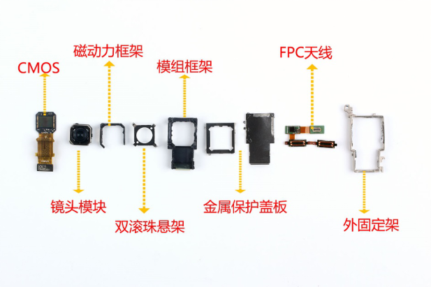 vivo X50 Pro的微云台主摄由外固定框,FPC软板,上下金属保护盖板,模组固定框架,双滚珠悬架,磁动框架,镜头模组和CMOS传感器组成。