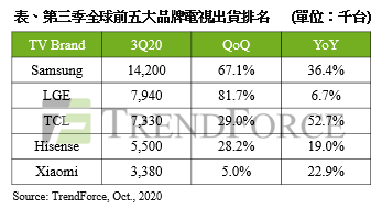其中TCL近年积极拓展海外市场,除了通过集团面板和代工厂进行垂直整合并优化成本,同时受惠于疫情衍伸的宅经济,使消费者对中小尺寸、主流电视产品需求大幅提升,进而拉升其第三季出货量至733万台,季增29%,年成长以52.7%居众品牌之冠。
