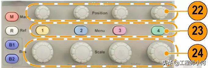22.垂直位置。旋转这些旋钮可以调整相应波形的垂直位置。按“精细”可以进行更小调整。