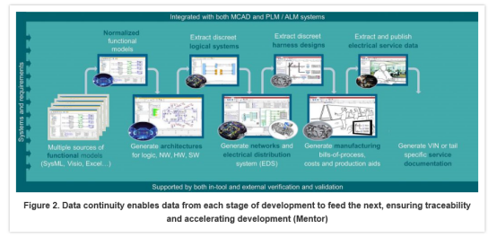 强大的数据模型对实现 MBSE 流程来说极其关键,在这一流程中,数据从定义到制造再到服务的过程中会保持连续性。这种连续性使电气分配系统 (EDS)、网络和软件开发各个阶段的工作数据为能够为下一步的流程服务(图 2)。这样贯穿开发流程的数字主线提高了工程师管理和变更的能力。由于每个领域都在同一数字主线中运作,工程师们可以在进行设计变更之前先充分了解其可能产生的全部影响,变更一旦通过验证,就能在相关的领域和设计中迅速执行。