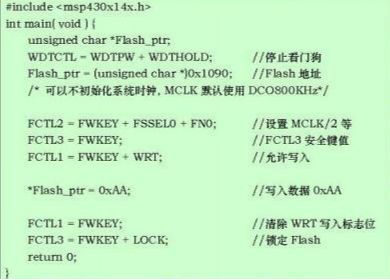 MSP430系列MCU尽管可以向FLASH存储模块的任意地址写入数据,但是擦除操作只能以段位基本单位操作,即最少只能擦除Seg_A和Seg_B段。从示例的程序中,可以看出段擦除的基本流程:除了启动擦除操作之前的基本设置,擦除之后的基本设置之外,还需特别注意的是:向要擦除的段(程序中位Seg_A)任意一个地址中写入任意数据以启动擦除操作。同样,这是一个简化的程序段,也没有检测BUSY等标志位。