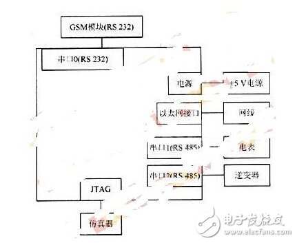 现以STR912FW44X6芯片作为硬件开发平台的MCU,STR912FW44X6外扩张了点阵LCD显示屏、输入按键、UART接口、IrDA、 CAN、USB、ETM接口、音频放大器/话筒放大器和以太网接口。其中,本文使用的有UART接口和以太网接口。UART接口分为一个RS 232串口和两个RS 485串口。RS 232串口用来与GSM模块的RS 232串口相连,以实现GPRS的无线传输;两个RS 485串口,一个用来作MODBUS通信接口,另一个用来接电度表计,以采集统计并显示太阳能发电系统的发电量。以太网通过网线连接到网络,以实现数据的无线传输。