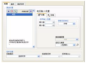 本文选用NI公司开发的USB-6251数据采集卡及Labview软件的Express技术快速实现光电开关的实时电压采集。USB-6251数据采集卡是NI公司最新推出的USB总线M系列数据采集产品,可提供高达16路模拟输入通道,并达到1.25 MS/s数据采集速率,且增加了USB即插即用的简单易用性以及全新高速信号流技术,可实时快速的采集各种物理信号。Express技术是Labview最新提供的一种快捷简便搭建专业测试系统的技术[1]。它将各种基本函数进一步打包为更加智能,功能更加丰富的函数;并对其中某些函数提供配置对话框,通过配置框可以对函数进行详细的配置,因此其可以实现较少的步骤完成功能完善的测试系统,尤其对于复杂的采集系统,Express技术起到了极大的简化作用。图 3为光电开关电压信号采集设置图,电压信号最大值及最小值设定为+10V及 -10V,采集率及待读取采样均设定为1,即1秒采集1个并实时的传到上位机,采集模式设为连续采样。