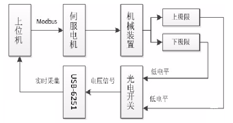 根据系统的功能要求本系统包括上位机、NI数据采集卡USB-6251、光电开关、交流伺服电机组成,机械装置五部分,系统组成框图如图 2所示。本装置采用美国国家仪表公司(National Instruments,简称NI)开发的数据采集卡USB-6251实时采集光电开关的模拟电压信号,当机械装置在运行行程中光电开光输出高电平,上位机不动作;而机械装置运行到预先设置上 /下极限位置时,光电开关输出低电平,上位机根据用Labview编订的程序完成计数、显示及判断等工作,并通过Modbus协议控制伺服电机向反方向运行,从而机械装置进入下一个循环周期,直至运行次数满足要求。运行频率 /速度由伺服电机的速度运行模式实现。