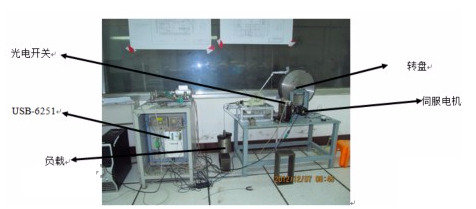 车辆的换挡杆试验台用来考核换挡系统的耐久性能的专用设备,也是车辆零部件试验中重要的试验之一。如某款车型试验要求如下:换挡杆经40万次试验后,换挡杆各零部件无破裂,操作灵活且无卡滞现象;换挡杆力载荷60N,频率要求0.5Hz。其中运行次数、换挡力载荷及运行频率均要求实时可变。图 1为最终搭建的换挡杆耐久试验台。其中重块作为负载,伺服电 机带动转盘旋转,通过与转盘连接的拉杆机构实现换挡杆动作,换挡杆的两个极限位置分别通过两个铁片和一个光点开关确定,并传输到USB-6251中,由于伺服电机与转盘的传动比为10,则电机转速设定为33rpm,满足试验要求。