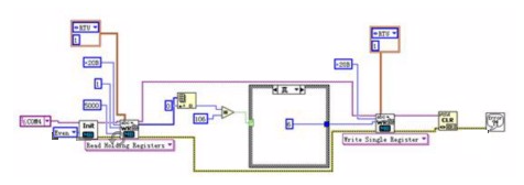 图 5为Labview程序采用Modbus协议控制伺服电机反转。Modbus 协议是应用于电子控制器上的一种通用语言,通过此协议控制器相互之间、控制器和其它设备之间可以通信。它已经成为一通用工业标准[2,3]。Modbus协议有两种传输模式:ASCII(American standard code for information interchange)或RTU(Remote terminal unit),两种方式均须指定串口通信参数(如波特率、校验方式等)。伺服电机预先设定以下参数:站号:1;传输模式:RTU;数据位:8;校验:偶校验;停止位:1;通讯超时:5000ms;串口号:Com4。并将电机内部寄存器20B(16进制)位置设定为命令输入反向控制,即此寄存器变化时(即由106变为006,或者由006变为106)电机反转;缺省为106,电机按先指定方向运行。图 5中程序首先提取内部寄存器20B位置的当前值,通过与给定值对比判断后再输入新值,从而实现电机反转的操作。