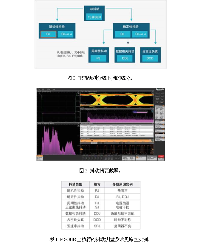 如果眼图交点分布宽,那么表明抖动是随机性的。如果眼图表现为由许多近乎不同的线组成,那么表明眼图是DDJ,可能源于信号路径中的阻抗不匹配,但眼图分析在查找眼图闭合根本原因时几乎没有什么帮助。在配备选配的高级抖动分析(DJA)包时,MSO6B可以测量多种抖动类型,找到硬件漏洞,包括:TIE,RJ,DJ,DDJ,PJ,TJ (总抖动),EH (眼高),EW (眼宽),眼高,眼低。表1列出了不同的抖动类型及导致抖动的原因实例。