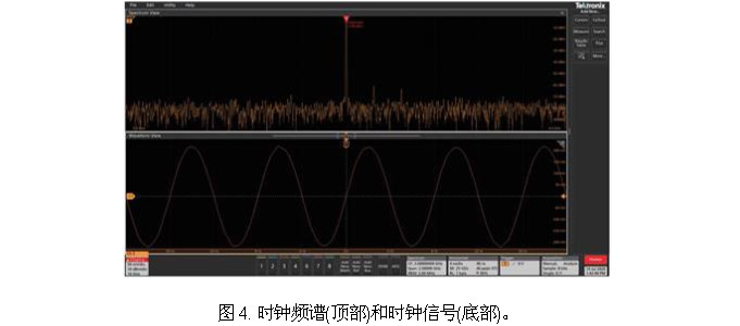 图4所示的时钟频谱和波形拥有干净锐利的谐振,但有许多杂散信号,约比谐振低50dB,在时域中会看到其影响。杂散信号在数据信号中可能会导致周期性抖动,但借助手边的杂散信号频率,我们通常能够找到问题,只需检查系统设计中的振荡器或开关电路是否会在这些频率产生EMI辐射。
