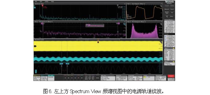 电源轨道噪声通常称为纹波,一般在几毫伏。在几GHz频率的电源轨道上准确测量几mV噪声,要求使用高DC阻抗的高带宽探头,其在高频下作为50 Ω传输线操作。TPR1000和TPR4000电源轨道探头就是专为这一目的设计的。在选配6系列B MSO数字功率管理(6-DPM)分析包后,您可以在多条电源轨迹上自动进行功率分析,该分析包可以方便地进行关键抖动测量(TIE, RJ, DJ, PJ)。