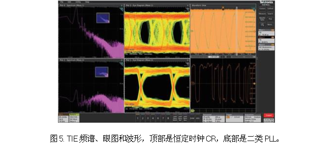图5显示了低的和不同的时钟恢复方式的影响,顶部是恒定时钟CR,底部是二类PLL,从左到右是TIE频谱、眼图和波形。周期性抖动在频谱中显示为杂散信号,随机性抖动显示为噪底。