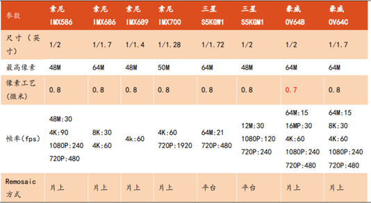 目前的旗舰手机的主摄一般都是采用索尼的CMOS 图像传感器,索尼在手机 CIS 领域拥有不可撼动的地位。三星暂时在 10800 万像素领域领跑行业,三星的 CIS得益于与小米、vivo 的合作,以及三星自家高端产品的应用,在中高端市场表现优异。豪威作为较晚研发出 48M 产品的厂商,打入中高端市场还需要更多的努力,目前豪威主打的 4800 像素产品 0V48B主要应用在 2000-3000 元的机型上。