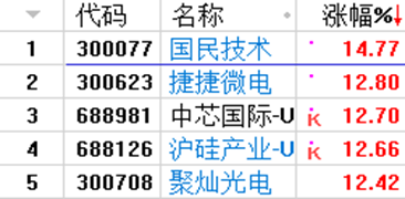 在112家半导体公司中,109家公司市值上涨,其中国民技术、捷捷微电、中芯国际、沪硅产业、聚灿光电涨幅居前;仅3家公司市值下跌,分别为火炬电子下跌1.28%、晶丰明源下跌0.92%、鸿远电子下跌0.57%。