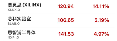 费城半导体指数成分股涨多跌少,涨幅居前的公司为赛灵思上涨14.11%、芯科实验室上涨5.19%、恩智浦半导体上涨4.97%;跌幅居前的公司为超威半导体下跌3.94%、英特尔下跌1.03%、英伟达下跌0.55%。
