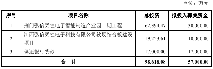 此次,弘信电子向不特定对象发行可转债计划募集资金总额不超过 57,000.00 万元(含57,000.00 万元),在扣除发行费用后,拟全部用于以下项目: