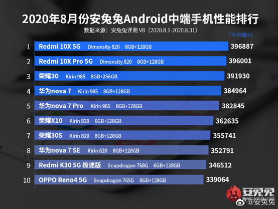 接下来是Android中端手机性能榜,与Android旗舰机性能榜高通一家独大不同,中端手机则是百花齐放,其中性能最强的是小米子品牌Redmi旗下的10X系列,它们搭载的天玑820芯片跑分接近40万分,成绩略高于搭载麒麟985芯片的荣耀30。