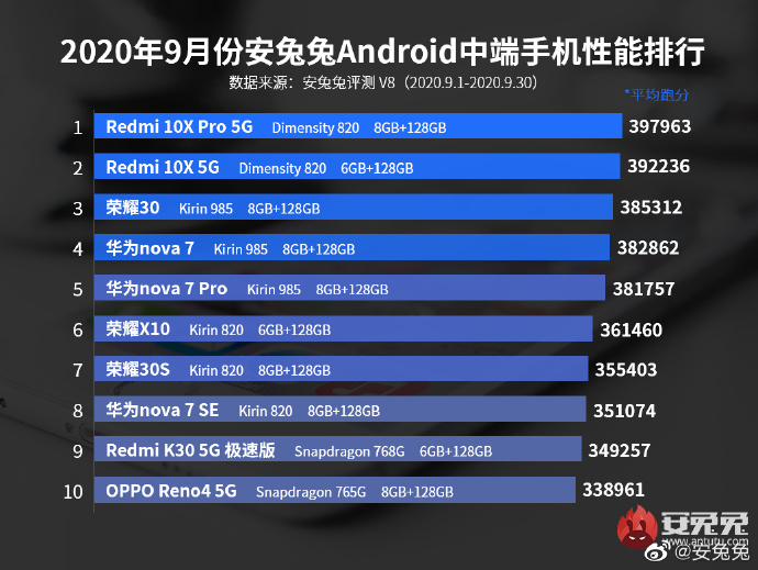 本次数据统计的时间为2020年9月1日到9月30日,榜单内成绩为统计到的平均成绩而非最高成绩,且单一机型数据统计量>1000条,数据均基于安兔兔V8版本计算,如果单一机型有多个存储容量版本上榜,以最高分的版本为主。
