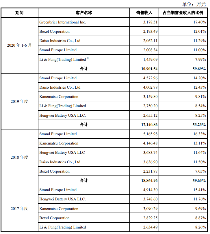 从前5大客户来看,该公司主营业务收入主要来自于外销,报告期各期,恒威电池出口销售金额分别为28,717.05万元、29,056.35万元、29,065.67万元及16,952.98万元,占当期主营业务收入的比重分别达到90.51%、92.44%、91.04%及93.42%。