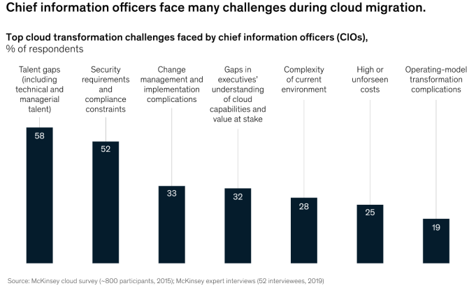 调查还显示,变化管理、向云迁移的软面正在产生巨大的挑战。企业不能忽视这些问题,因为改变员工的心态和习惯与建立技术堆栈一样重要。一名受访者指出:“这不仅需要自上而下的决策,还需要运营上的参与;另一位则认为有必要“对企业如何运作的思维方式进行全面转变”。