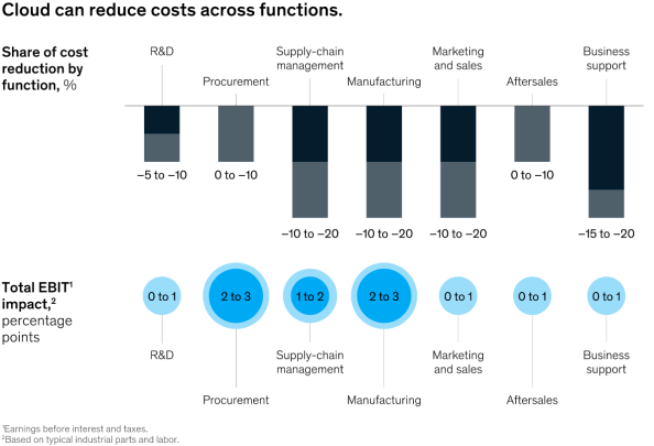 云可以从根本上改善研发、采购、供应链、制造、营销和销售、售后和业务支持等流程的整体效率。它所提高的效率可以显著提高利润率和生产率。例如,在采购方面,云可以帮助企业清理和整合他们的数据,这促进了无缝和自动化的机会识别(例如,在商品波动下,可定向为供应商寻求成本优惠)。云计算还可以更快速、更大规模地捕捉新的采购工具,比如与花费智能或电子信息和报价请求相关的工具。这些采购方面的改进可以在采购节约方面产生60%的改进。下表显示了云对工业公司其他功能的典型影响。