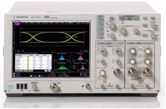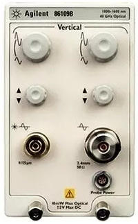 86109B 是一个 40GHz 光信号 / 50GHz 电信号测量模块,可以安装在 DCA-X 主机上。前面板长这样。左边的接口是光信号输入端,右边的是电信号输入端。