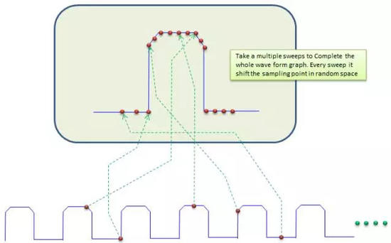 与实时示波器不同,采样示波器主要用来测量重复信号。它的采样率很低,通常只有几十或者几百 KHz,却可以用于 GHz 信号的测量。原因就是因为被测信号是重复性的,采样信号每次都可以采集在一个信号周期的不同位置,这样多次采集后就可以通过采样点将一个周期的信号恢复出来。