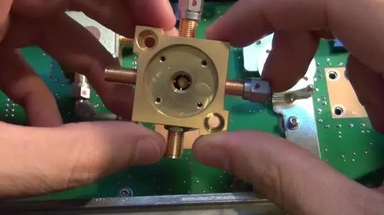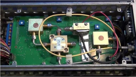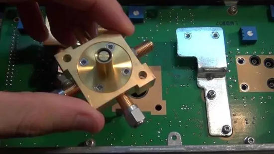 驱动电路放大后的时钟信号,经过上面的特殊接口,穿过电路板进入到 Step Recovery Diode 电路(上图封装在金属盒内部),变成非常快速的脉冲信号输出。它最多有四路输出(周围四个方向),在这里只用了其中两路用于光信号和电信号的采样。