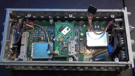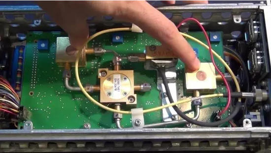 最后我们将一开始看到的采样模块拆开,里面的结构也挺复杂的。因为输入进去的信号频率很高,而整个腔体是由金属制成,所以里面还贴了吸波材料防止信号在腔体内反射共振。而镶嵌在中间就是采样示波器的关键部分——采样头。