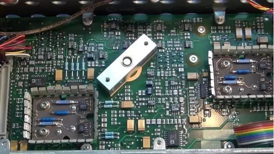 驱动电路与主电路板之间的连接方式很独特,我们从来没在其他的电路上见过这样的设计。在主电路板上有一个 45 度角放置的长方体金属底座(下图中间位置),与驱动电路背面的金属层紧扣在一起。中间的接头用于与时钟信号连接,两侧是两个螺丝孔。