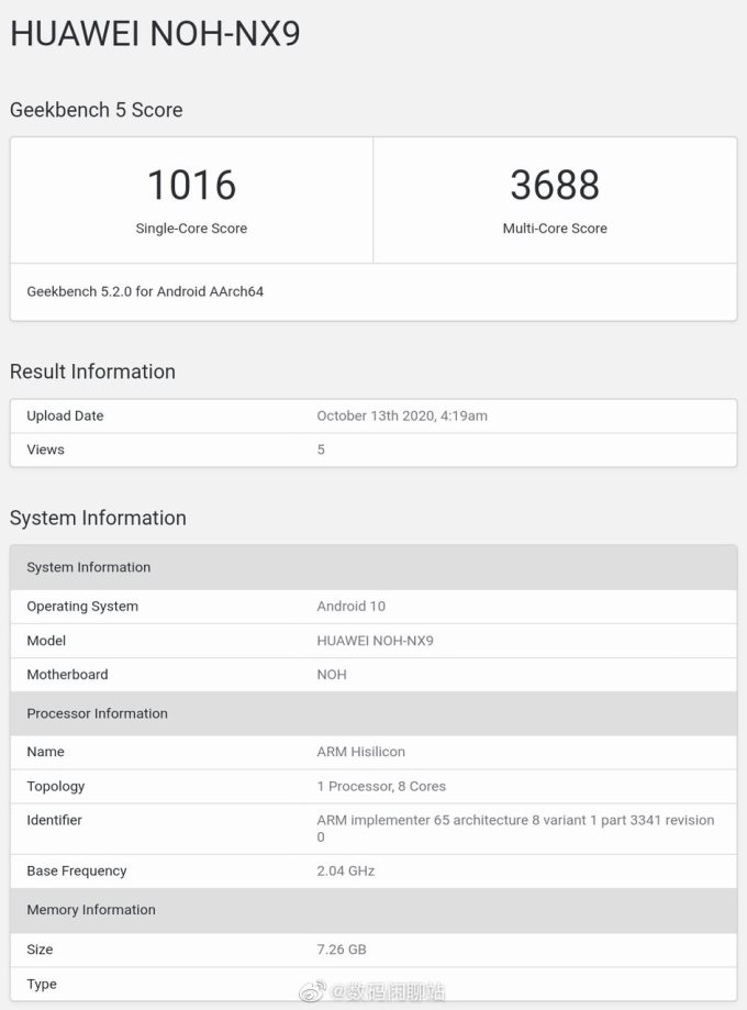 昨天,GeekBench 5 的数据库中出现了名为 NOH-NX9 的华为新机,这就是即将发布的 Mate 40 Pro。