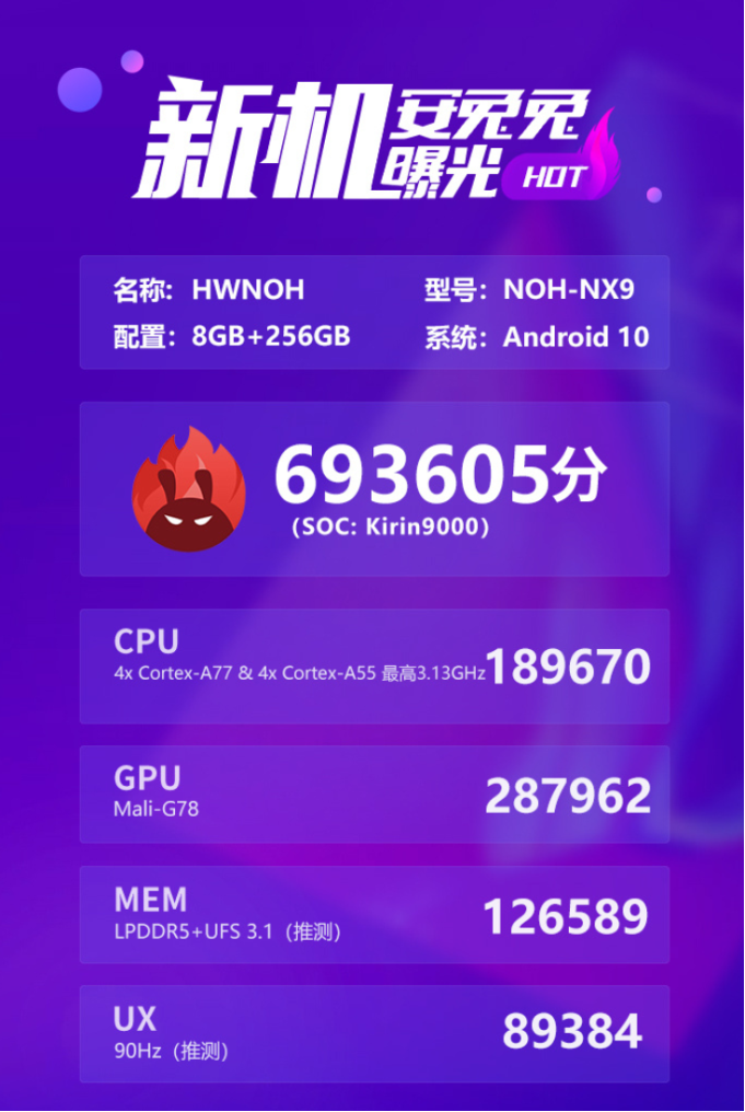 不只是 GeekBench 5,安兔兔也表示在后台查到了华为 Mate 40 Pro(NOH-NX9)的跑分数据——693605 分。