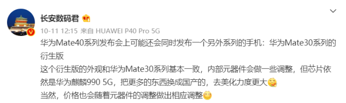 除了 Mate 40 系列之外,此次发布会华为还可能带来一款新 Mate30。
